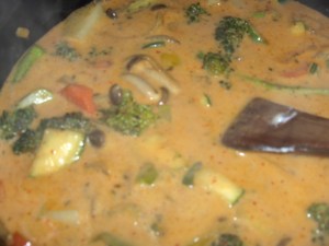I’ve been buying tiny Thai tins of curry paste by a company called Maesri.  One tin is meant to do one curry with only one tin of coconut milk.  DO NOT fall for this trick.  I did once…it is amazing, but evil, in it’s hotness!  So, I use one tin of Maesri Red paste, two tins of whatever cheap coconut milk is on offer and mix up the sauce in a separate pan.  Then I chop up and saute the veges I am using (last night was a concoction of broccoli, yellow and green capsicum, carrots, courgettes, onions, potatoes and tiny brown mushrooms).  I add fresh ginger, garlic, coriander, a little salt and liberal splashes of fish sauce to the veges while they are being sauteed.  Then I add most of the sauce to the veges and let them simmer while I cook about a cup of white rice.